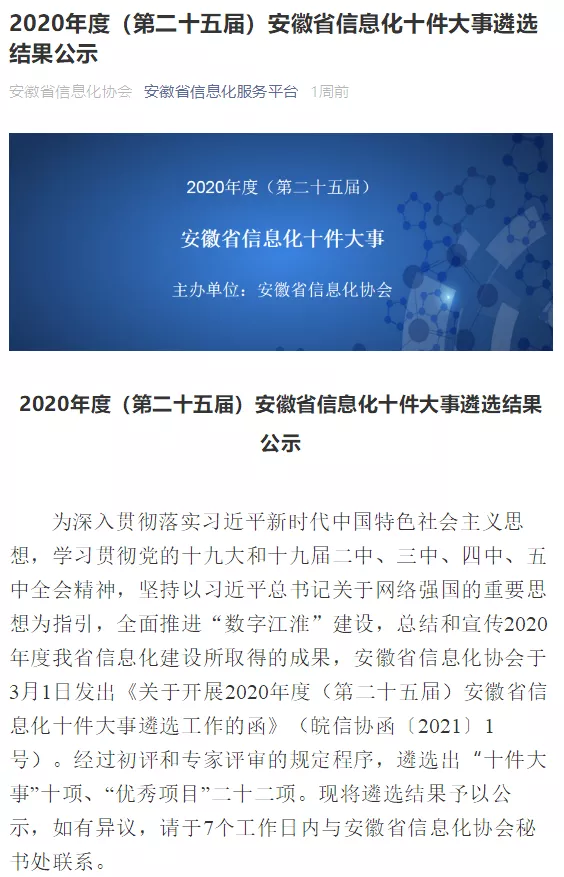 近日,安徽省信息化协会公示了2020年度(第二十五届)安徽省信息化十件大事遴选结果,乐玩lewin官网信息申报的“芜湖市信息资源安全治理项目”经过初评和专家评审,成功入选2020年度安徽省信息化十件大事,标志着我公司信息化建设再上新台阶。