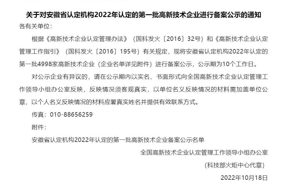 10月18日,安徽省认定机构对2022年认定的第一批高新技术企业进行了备案公示。安徽乐玩lewin官网信息继2016年,2019年,第三次被认定为